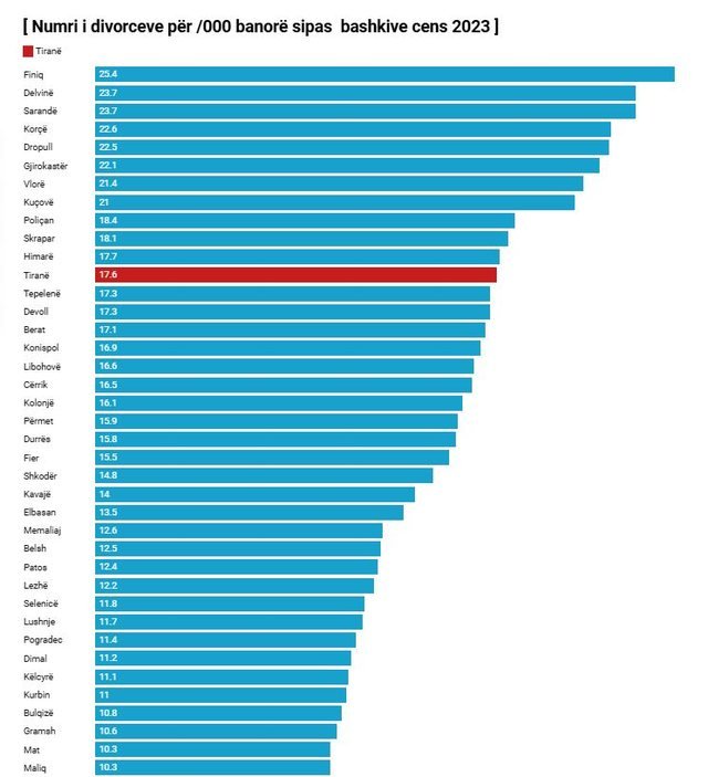 Bashkitë e mëdha si Tirana (17.6 divorce për 1000 banorë), Durrësi (15.8) dhe Fieri (15.5) kanë norma divorci rreth mesatares kombëtare, duke reflektuar dinamikën e metropoleve me urbanizim, rritje të pjesëmarrjes së grave në tregun e punës.
