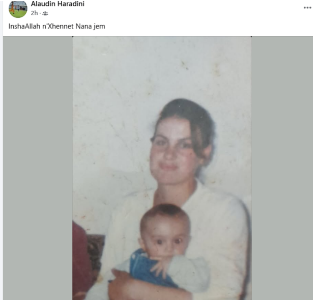 Djali i të ndjerës, Alaudin Haradini, përmes një fotoje ku shihet në krahës e nënës së tij kur ka qenë foshnjë, ka bërë një dedikim prekës.