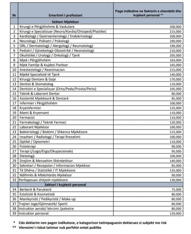 “Kjo listë do të shërbejë si një instrument referues për analizën e riskut, me qëllim identifikimin e rasteve të mundshme të mosdeklarimit të pagave reale të punonjësve. Në këtë kuadër, Administrata Tatimore do të analizojë të dhënat e deklaruara në listëpagesat e subjekteve që operojnë në këto sektorë, duke i krahasuar ato me nivelet indikative të pagave sipas profesioneve përkatëse”, thuhet në njoftimin e Administratës Tatimore.