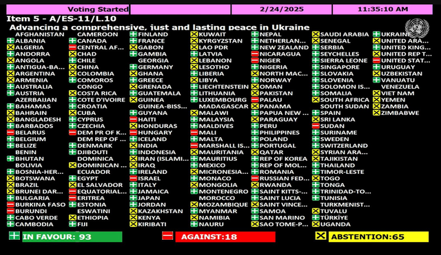 Gjithsej 93 vende votuan pro, 18 kundër dhe 65 abstenuan. Përveç Rusisë dhe SHBA-së, Koreja e Veriut, Bjellorusia dhe Hungaria e kundërshtuan rezolutën që bën thirrje për tërheqjen e trupave ruse.