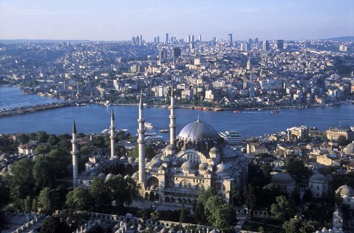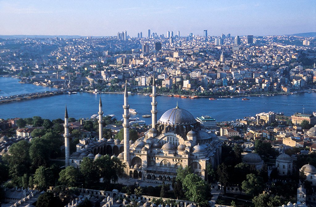 Aerial view of Istanbul city scape, with the Suleymanie Mosque ( built AD: 1550-1560) in foreground, the Golden Horn and modern Istanbul in the background, Turkey. (Photo by In Pictures Ltd./Corbis via Getty Images)