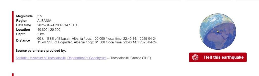 Sipas të dhënave të publikuara nga Qendra Sizmologjike Evropiane (EMSC), epiqendra e tërmetit ka qenë 11 kilometra larg Pogradecit dhe rreth 60 kilometra nga Elbasani, në një thellësi prej vetëm 5 kilometrash – gjë që shpjegon pse lëkundjet janë ndjerë fort.