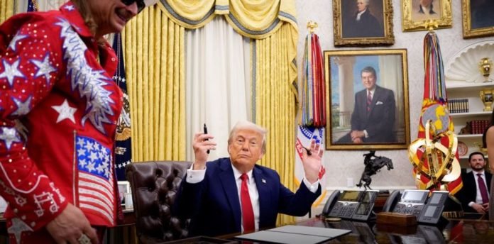 If the moment wasn’t surreal enough, Trump was flanked by Kid Rock, who was resplendent in a spangled Stars and Stripes-themed suit and who the president helpfully pointed out is “sometimes referred to as Bob.” The rapper was there to highlight a new executive order cracking down on scalpers who exploit fans by inflating concert ticket prices. But his host had an older obsession on his mind.